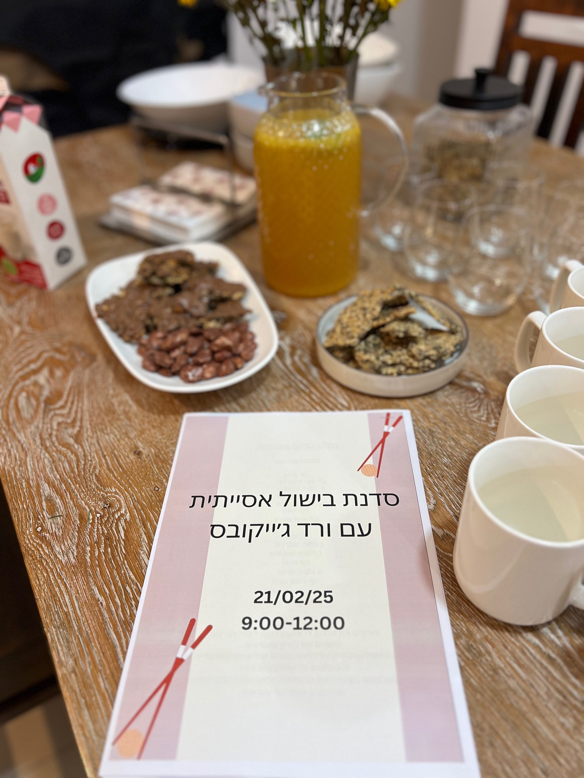 נתחיל עם פוקאצ'ה חמה וחטיפי גרנולה ושוקולד הכל עבודת יד וכמובן שתייה חמה וקרה